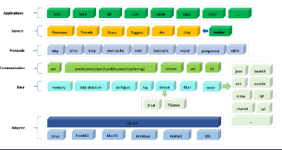 The Acl (Advanced C/C++ Library) project a is powerful multi-platform network communication library and service framework, supporting LINUX, WIN32, Solaris, FreeBSD, MacOS, AndroidOS, iOS. Many applications written by Acl run on these devices with Linux, Windows, iPhone and Android and serve billions of users. There are some important modules in Acl project, including network communcation, server framework, application protocols, multiple coders, etc. The common protocols such as HTTP/SMTP/ICMP//MQTT/Redis/Memcached/Beanstalk/Handler Socket are implemented in Acl, and the codec library such as XML/JSON/MIME/BASE64/UUCODE/QPCODE/RFC2047/RFC1035, etc., are also included in Acl. Acl also provides a unified abstract interface for popular databases such as Mysql, Postgresql, Sqlite. Using Acl library users can write database applications more easily, quickly and safely.