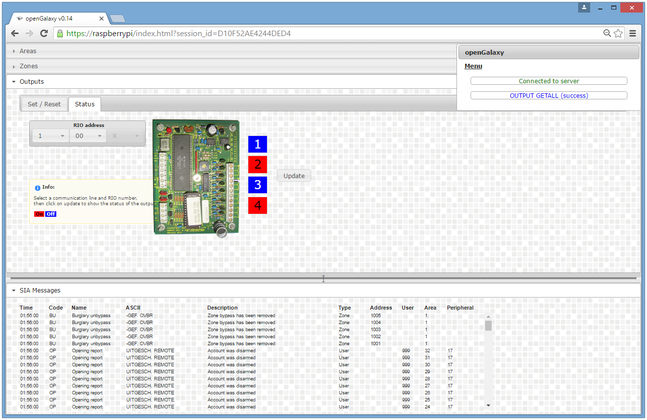 This project aims to provide a method for listening on a serial port and decode incoming messages from a Galaxy security control panel. The messages are transmitted using the SIA DC-03-1990.01 (R2000.11) protocol. The decoded messages are stored in a database (MySQL) or forwarded by email using ssmtp. Besides just listening for messages openGalaxy can also be used to arm/disarm the panel and much more...