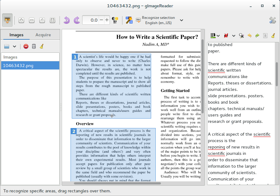 I find gImage Reader a practical and stable frontend to Tesseract OCR.Spell checking and editing text works fine for normal purposes where Tesseract OCR nowadays is very accurate.Unusual fonts as Fraktur (in heads of many longstanding newspapers) is supported and the Tesseract engine will (with effort) train any uncommon typography.The gImage frontend is stable and uncomplicated to work with when set up, and the only improvement I can think of is a way to easily close the sources pane for maximizing the head pane when reviewing and editing recognised text.A very useful program, thank you. Edit: glad to find a toggle option for the suggested improvement already exist (I'm slightly visionary impaired).The Tesseract Fraktur "language" I work with is fine but not programmed to trigger the spell checker and the output therefore interpreted with spelling errors / understrikes.This small problem (unrelated to gImageReader) could be solved by a spell checker on/off switch.Thank you again.