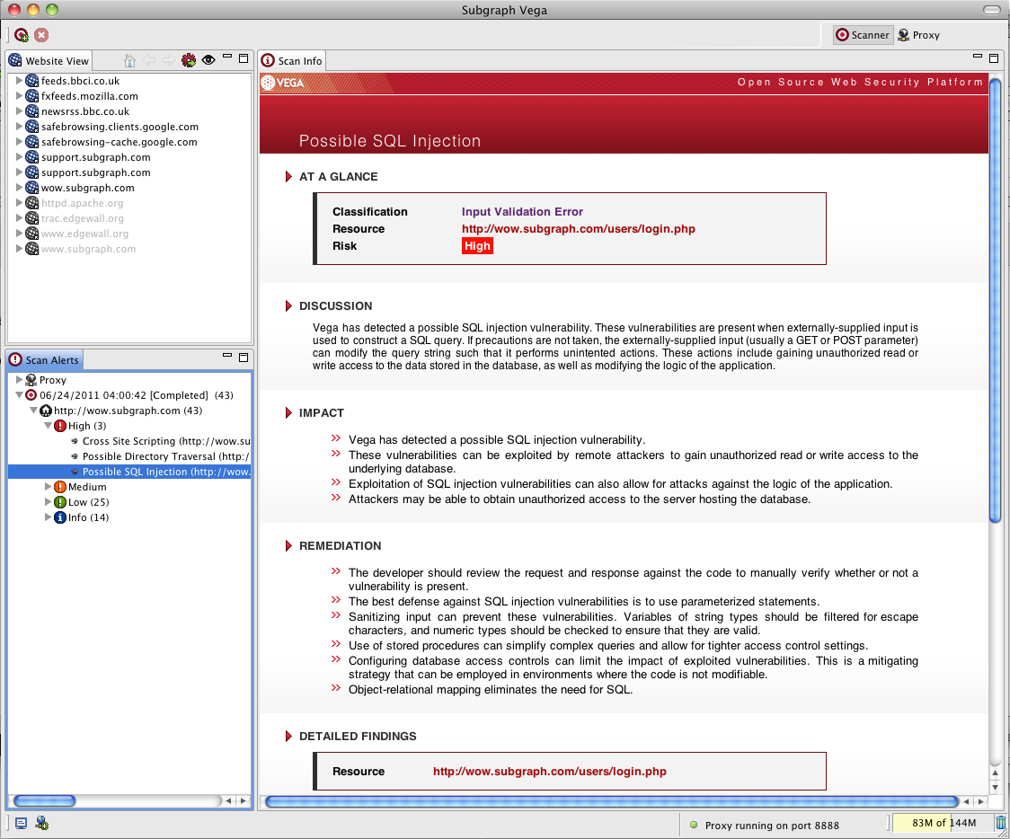 Vega can help you find and validate SQL Injection, cross-site scripting, inadvertently disclosed sensitive information, and other vulnerabilities. It is written in Java, GUI based, and runs on Linux, OS X, and Windows. Vega can help you find vulnerabilities such as: reflected cross-site scripting, stored cross-site scripting, blind SQL injection, remote file include, shell injection, and others. Vega also probes for TLS / SSL security settings and identifies opportunities for improving the security of your TLS servers. Vega includes an automated scanner for quick tests and an intercepting proxy for tactical inspection. The Vega scanner finds, SQL injection, and other vulnerabilities. Vega includes a website crawler powering its automated scanner. Vega can automatically log into websites when supplied with user credentials.