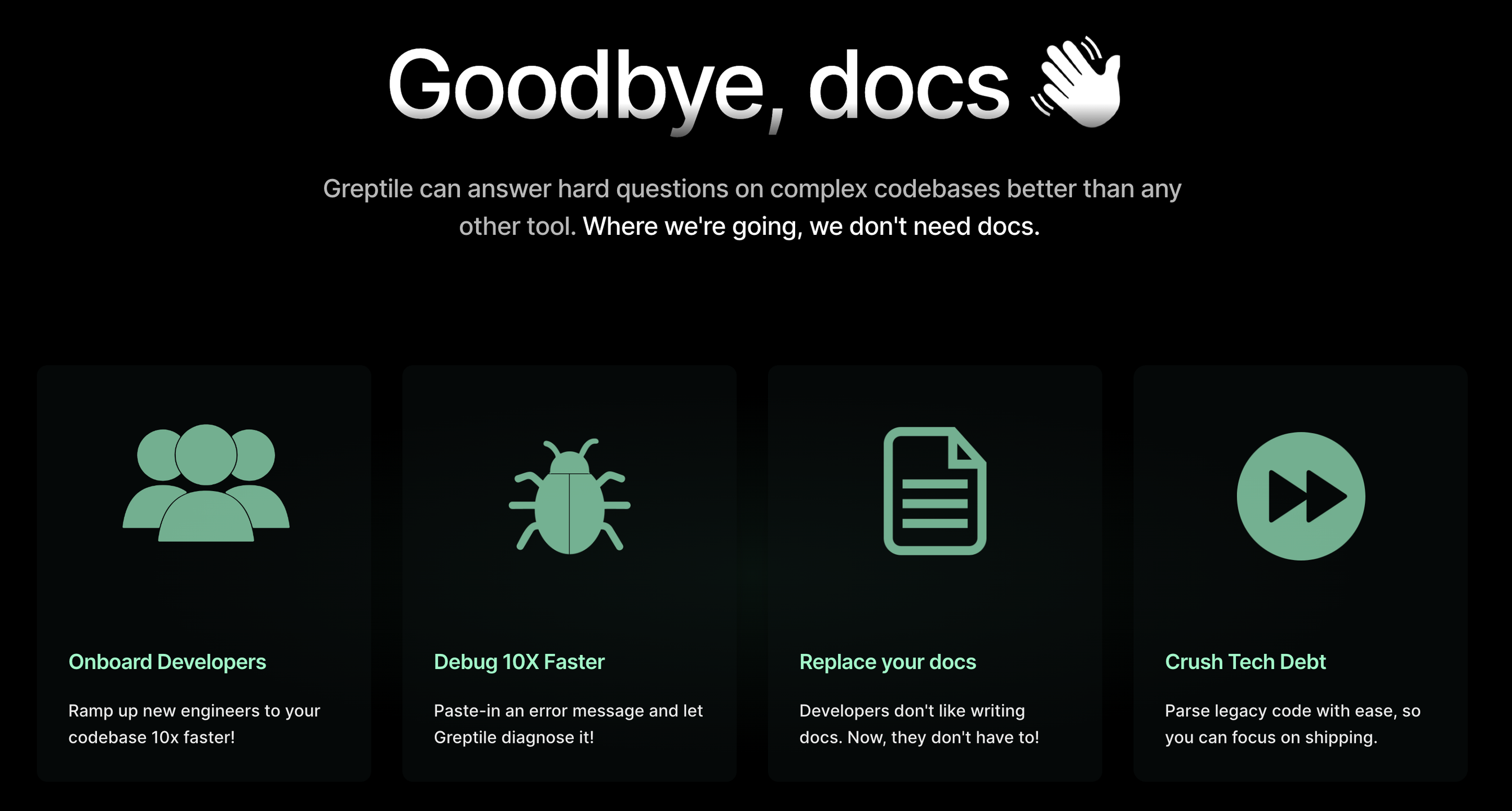 Greptile can answer hard questions on complex codebases better than any other tool. Greptile answers questions like that one 100X dev on your team who's been around for years and knows the codebase cold. Search across multiple branches of multiple repos all at once. Multi-repo codebases, open source dependencies and more. Locate code deeply hidden in messy, legacy codebases by simply describing it in plain English. Thanks to our semantic abstraction layer, Greptile works with most public programming languages.