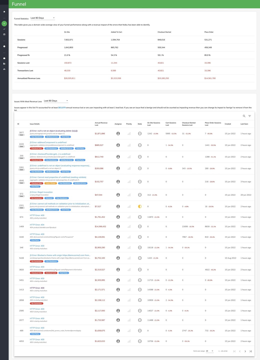 Deliver better digital experiences. Prevent lost revenue. Detect, prioritize & resolve critical ecommerce errors with Noibu. The Noibu error monitoring platform. Detect and prioritize ecommerce errors, and have everything your team needs to resolve them with the Noibu platform. Detect Over 90% of website errors are never reported by customers. Noibu monitors your ecommerce site and flags errors in real-time. Whatever the cause, nothing gets missed. Prioritize. The combination of multiple plugins, browsers, devices, and customer activity can result in dozens or even hundreds of website errors. Noibu surfaces the critical errors that are hurting sales and conversions in your checkout. Resolve. Without knowing exactly how an error occurred, developers can spend hours trying to replicate it. Noibu removes all the guesswork by providing detailed web session information for each error, and which error to fix first.