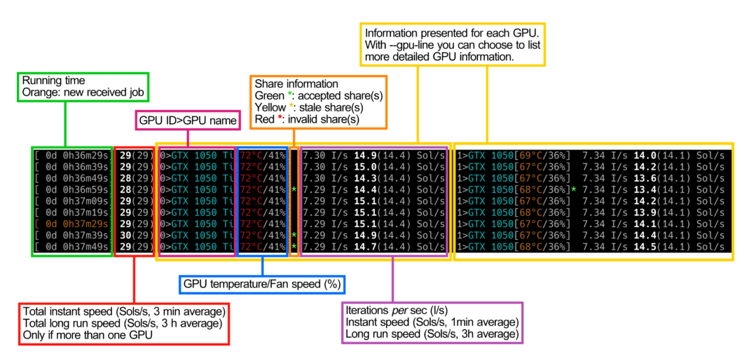 miniZ is a fast and friendly Equihash miner. Although miniZ was not tested on all available GPUs, it is expected to run on all Kepler, Maxwell, Pascal, and Turing architectures. Because it is important to have feedback while miniZ is running, some information (speed, GPU temperature) will be presented on the console window. First, you’ll see a header listing the command line parameter values. Although miniZ will give warning for common mistakes, it is good to confirm that all is correct. As stated elsewhere, the fee is set up to 2% of the total mining time. When looking at server share percentage values it is possible that your pool share is >98%, this means that the program will soon switch for the fee pool. Similarly, when the fee pool share is >2% the program will soon switch for your pool. In the beginning these percentage values will show less balanced, this is only because the total running time is, at that moment, too short (Ex. 10 s is about 8% of a running time of 2 min).